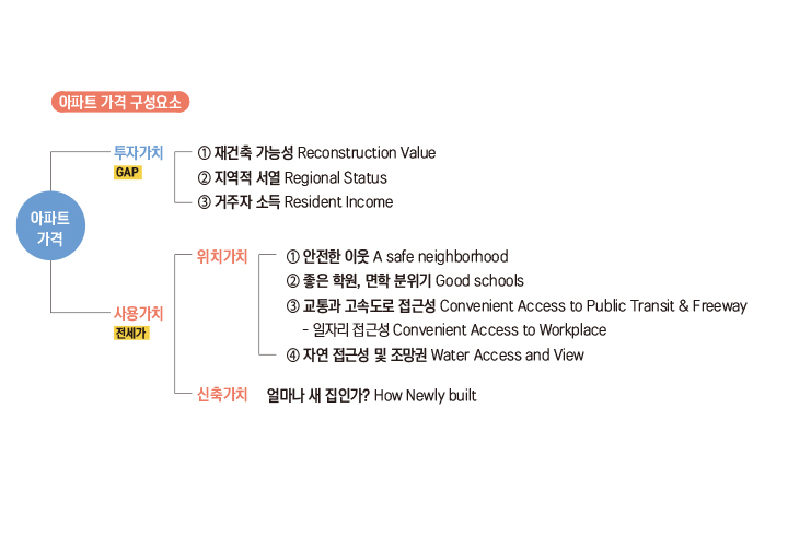 재건축이란 낡은 건물을 부수고 새로운 주택을 짓게 될 때 미래에 소유자에게 돌아갈 경제적 이득이 오늘날 주택 가격에 포함된 것을 말한다. 또한 그 밖에도 흔히 이름값이라고 불리는 지역적인 서열 그리고 거주자들의 소득수준이 미래 주택의 월세상승률에 영향을 미치므로 이 또한 미래의 소유자에게 돌아갈 경제적 이득으로 여겨져서 투자가치에 해당된다. 이런 투자가치는 흔히 주택 가격에서 전세 가격을 뺀 나머지, 흔히 ‘갭’이라고 불리는 것인데 대체로 지방보다는 서울이, 또 일반 주택보다 아파트가 더 높다. GAP은 금리에 가장 큰 영향을 받는다. 만일 10억 원 주택에 전세가 6억 원이라면 GAP은 4억 원이 되는데 거주만 한다면 6억 원만 부담해도 될 것을 굳이 4억 원을 더 주고 집을 산다는 것은 투자자의 입장에서 4억 원은 자본투자가 되는 셈이며 4억 원을 은행예금에 넣어두는 것보다는 집을 샀을 때가 그 이상으로 주택가격이 상승한다는 판단을 했기 때문일 것이다.