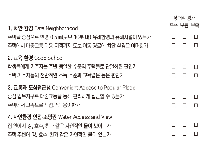주택의 위치가치의 중요도는 보통 치안>교육>교통 순이지만 이 세 가지는 우열을 가리기 힘들 정도로 모두 중요하다. 다만 넷째 자연환경인 물과 공원과 같은 녹지는 앞의 세 가지보다는 후순위라고 할 수 있다. 예를 들어 치안, 교육, 교통이 우수한데 물과 공원까지 인접해 있다면 그곳은 정말 프리미엄 입지일 수 있지만 앞에 세 가지는 뛰어나지 않지만 물과 공원이 있는 입지라면 그건 그냥 시골일 수 있다는 의미다. 정말 좋은 위치가치를 가진 입지를 어떻게 알 수 있을까? 그것은 의외로 간단하다 결국 모든 것은 사용가치를 나타내는 척도인 전세가에 나타나 있기 때문이다. 하지만 지금 시장에서 평가되는 위치가치는 상대적으로는 변할 수 있기 때문에 비슷한 수준의 주택의 위치가치를 비교하면서 평가하는 임장을 해보는 것이 입지를 보는 안목을 키우는 데 가장 중요하다. 다시 말하자면 스스로 임장의 평가 리스트를 만들어 비슷한 매매가격과 평형 그리고 연식의 주택을 동시에 임장해서 점수를 매겨보는 습관을 가져보면 큰 도움이 된다. 임장이란 부동산을 직접 현장에서 살펴보는 것을 말하는데 요즘은 주택을 둘러싼 주변 환경을 보려면 오히려 인터넷 화면으로 지도를 놓고 로드 뷰를 보면서 비교해 보는 것이 훨씬 도움이 되기도 한다. 결국 임장을 하되 사이버 임장을 하라는 뜻이다. 이때 가장 중요한 것이 바로 상대평가를 해야 한다는 것이다. 부동산은 가치가 상대적이기 때문에 아래에 위치가치 평가 리스트를 만들어서 평가해보자. 만일 10개의 주택을 평가한다고 할 때 반드시 3분의 1은 우수, 3분의 1은 보통, 3분의 1은 부족을 주어야만 상대평가가 가능하다. 아래의 평가 리스트는 예시로 만들어 본 것이다 우수는 3점, 보통은 2점, 부족은 1점을 주면서 여러 개의 주택을 상대평가 해보자.(아래의 항목 외에 본인이 중요시하는 질문을 추가해보자.)