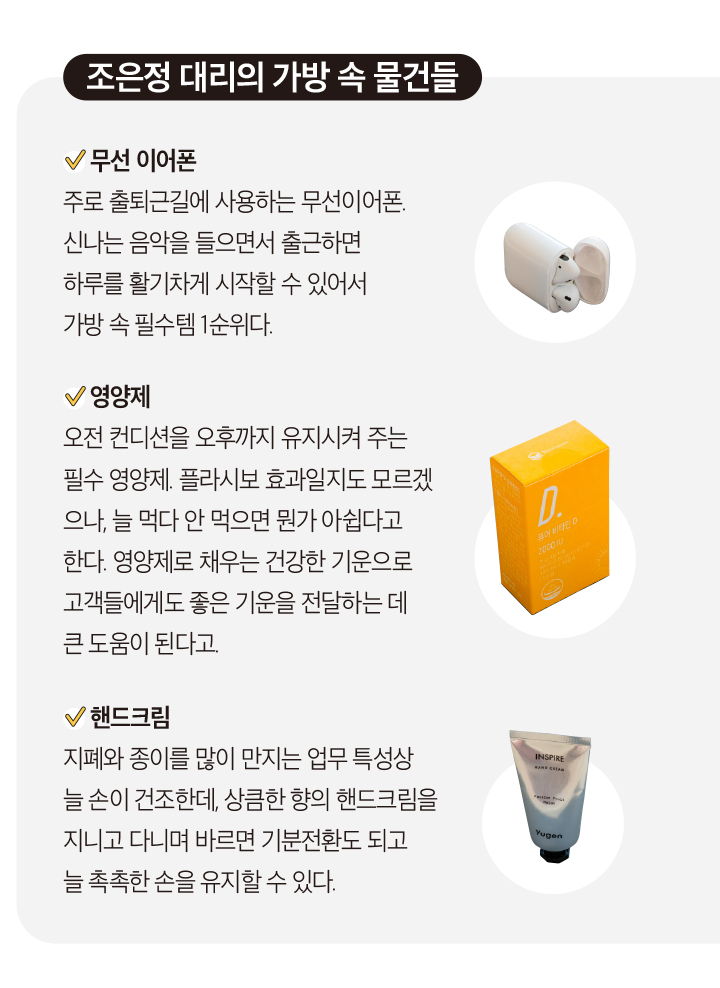 정 대리는 은행 업무를 어려워하시는 어르신분들께 종이에 글자를 크게 적고 최대한 천천히, 또박또박 설명을 하며 이해를 돕는다고 한다. “5년 전 예금상담을 도와 드린 고객님이 계십니다. 당시 저의 친절한 응대가 고객님을 감동시켰죠. (웃음) 시간이 몇 년이나 지난 지금도 지점 근처를 지나실 일이 있으면 들러서 제가 좋아하는 라떼 커피를 건네주고 가십니다.” 당연히 해야 할 일을 했을 뿐인데, 여전히 자신을 기억하며 고마운 마음을 전해주는 고객들 덕분에 뿌듯하다는 조은정 대리. 그 마음을 떠올리며 ‘오늘’을 버틴다고.