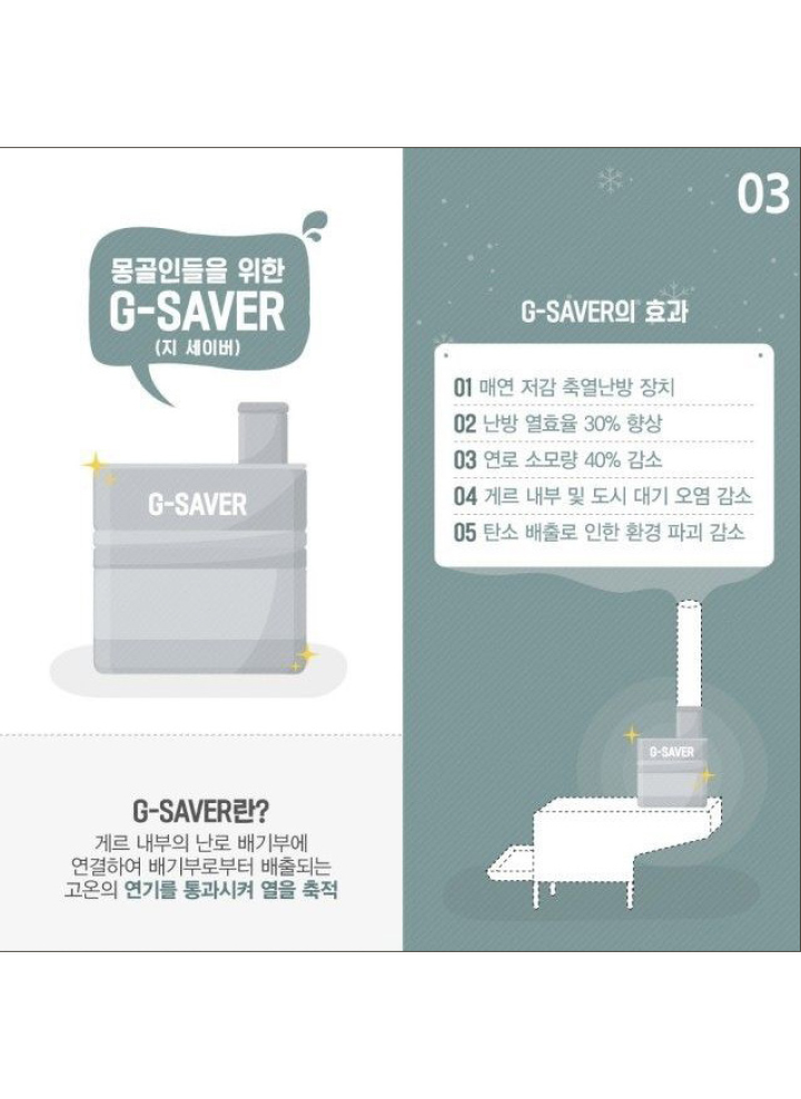 1년 중 8개월간 영하 20~40℃의 추위를 견뎌야 하는 몽골인들에게 우리나라 적정기술로 만든 난로 지 세이버(G-Saver)가 크게 환영받고 있다. 난방 열효율이 높을 뿐 아니라 대기 오염도 감소시켜주는 난방 관련 적정기술에 대해 알아보자.