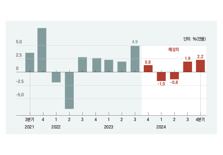 그렇다면 2024년도는 미국의 경기하락의 속도에 따라서 통화정책의 방향이 바뀌고 그에 따라 자산시장이 단기적으로 반등하거나 하락할 가능성이 높다는 결론이다. 현재 2024년도 미국경제전망은 경기침체 VS 경기 연착륙 이란 두 가지 전망이 팽팽이 맞서고 있다. 따라서 가상의 시나리오를 가지고 미국경제전망과 자산시장의 변화를 예상해보자. 얼마전 미국 상무부는 자료를 통해 2024년도 분기별 미국경제의 성장전망치를 내놓았다. 이 전망에 따르면 2024년 1분기와 2분기는 –1.0% 그리고 –0.8% 성장으로 경기가 크게 하락할 것으로 예상했는데 두 분기 연속 성장률이 마이너스라면 보통 경기침체라고 진단한다.