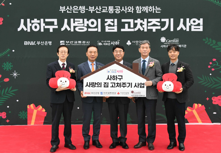 부산은행은 12월 14일 사하구종합사회복지관에서 부산교통공사, 부산사회복지공동모금회와 함께 ‘사하구 사랑의 집 고쳐주기 사업’ 발대식을 가졌다. 지난 6월 사상구를 시작으로 이어오고 있는 ‘사랑의 집 고쳐주기 사업’은 지역 주민들의 주거복지 개선을 위해 민관이 협업해 추진하는 사업으로, 부산은행은 사하구 지역의 주거 환경이 어려운 수급자 및 차상위계층 15가구와 노인여가복지시설 5개소 등 총 20곳에 LED전등과 도배, 장판 등 구입비용을 지원한다.