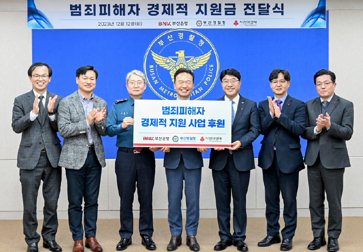 부산은행은 12월 12일 부산경찰청에서 부산사회복지공동모금회와 함께 ‘범죄피해자 경제적 지원 사업’ 후원금 전달식을 가졌다. ‘범죄피해자 경제적 지원 사업’은 여러 강력범죄 등으로 피해를 받은 피해자들의 빠른 일상 회복을 돕기 위해 별도의 선정 절차를 거쳐 긴급 치료비, 생계비 등을 지원하는 공익사업으로, 부산은행은 이번 전달식을 통해 부산 사회복지공동모금회에 범죄피해자의 경제적 지원을 위한 기금 2,000만 원을 전달하고, 부산경찰청은 지원 대상자를 선정해 피해자 지원에 앞장 설 예정이다.
