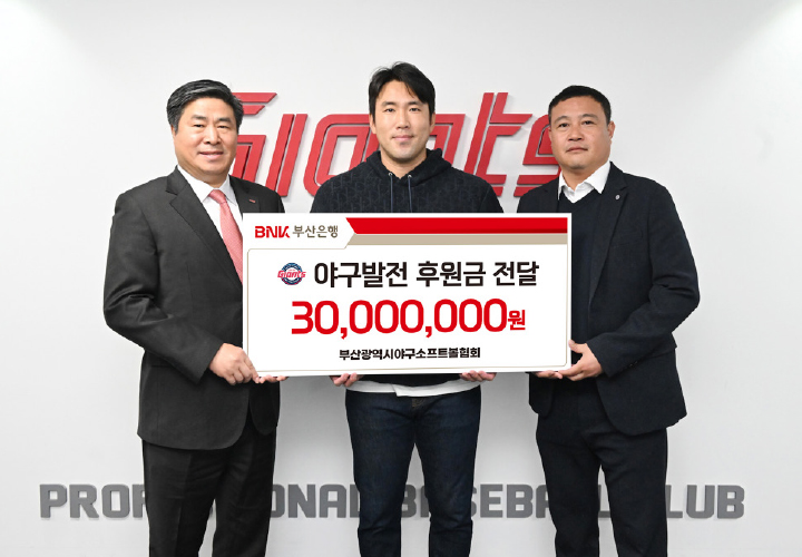 부산은행은 12월 11일 부산 사직구장에서 ‘부산광역시야구소프트볼협회’에 유소년 야구부 후원금 3,000만 원을 전달했다. ‘BNK가을야구정기예금’ 판매 수익금으로 조성된 후원금으로 부산지역 초·중 야구부 총 14곳의 야구공 구입비용으로 사용될 예정이다. ‘BNK가을야구정기예금’은 2007년 첫 출시 이후 올해까지 17년째 판매되고 있는 부산은행의 대표적인 스포츠 연계 마케팅 상품으로, 롯데자이언츠의 성적과 연계해 우대금리를 제공하며 상품 수익금의 일부를 지역 청소년 야구부에 후원해 오고 있다.