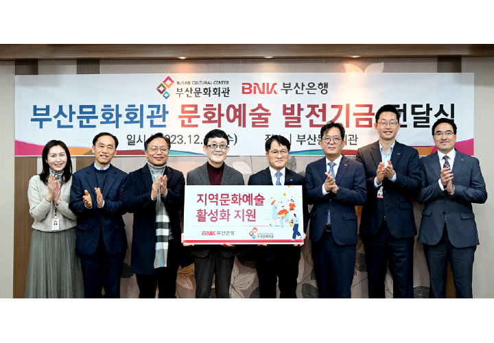 부산은행은 12월 13일 재단법인 부산문화회관에 지역 문화예술 활성화를 위한 후원금 3,000만 원을 전달했다. 이날 전달한 후원금은 2024년 1월에 부산문화회관에서 개최하는 ‘2024 챔버 페스티벌’을 시작으로 지역에서 열리는 다양한 문화예술사업에 쓰일 예정이다.