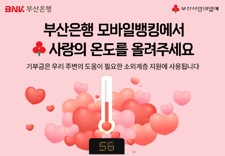 부산은행은 12월 1일 지역 온정 나눔에 힘을 보태고자 ‘희망2024 나눔캠페인 모바일 모금함’을 운영한다. 희망나눔캠페인은 매년 사회복지 공동모금회(사랑의열매)가 연말 어려운 이웃을 돕기 위해 진행하는 성금 모금 캠페인으로, 부산은행 모바일뱅킹 이용고객은 모바일뱅킹 내에 안내팝업 또는 기부서비스 메뉴를 통해 모바일 모금함을 간편하게 이용할 수 있다. 올해 ‘희망2024 나눔캠페인’은 ‘기부로 나를 가치있게, 기부로 부산을 가치있게!’라는 슬로건과 함께 부산지역 총 모금액 108억 6,000만 원을 목표로 2024년 1월 31일까지 두 달간 진행된다.