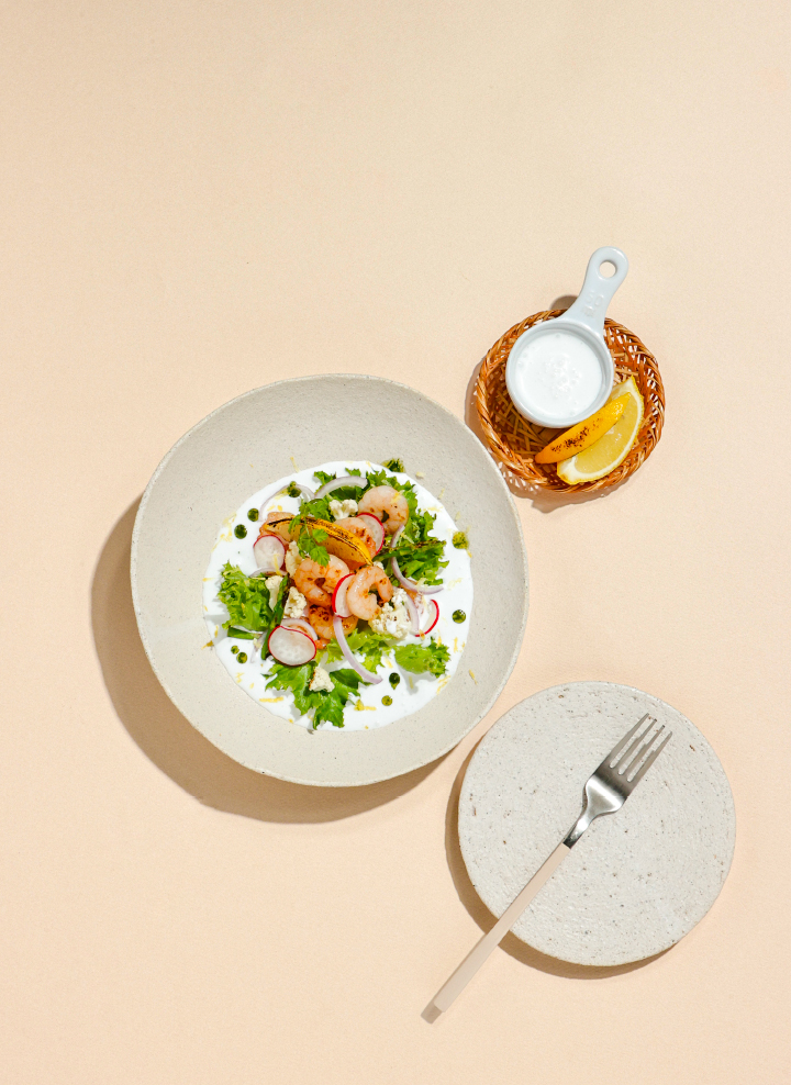 새우는 그릴에서 센 불로 불맛을 입히고, 신선한 잎채소, 레디시, 아스파라거스, 적양파까지 넣고 구운 레몬즙과 함께 섞는다. 여기에 코코넛밀크 드레싱에 대파기름까지 더해주면, 파인 다이닝 부럽지 않은 일품 샐러드가 완성된다.