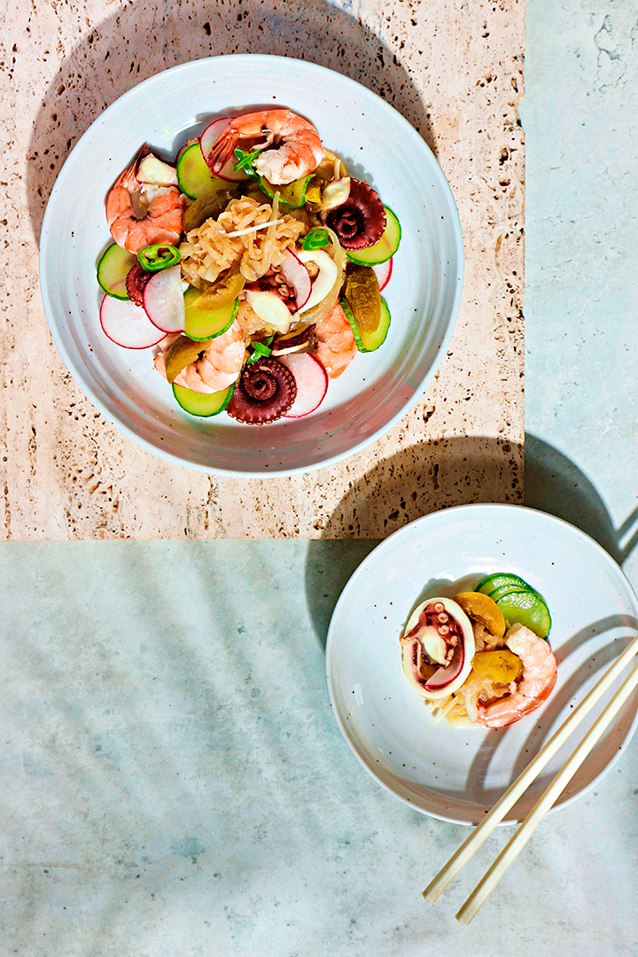 울릉도의 싱싱한 오징어, 그리고 쫄깃한 돌문어 거기에 오동통한 새우까지 이것만으로도 이미 요리지만 제철 식재료 매실 엑기스와 연겨자, 참깨를 넣은 드레싱으로 살살 버무리면 맛있는 해산물 냉채가 된다.