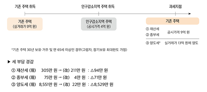 기획재정부가 발표한 ‘인구감소지역 부활 3종 프로 젝트’ 추진 방안에 따르면 집을 한 채만 가진 사람이 인구감소지역에서 공시가격 4억 원 이하 주택을 한 채 더 사도 ‘1주택자’로 간주돼 재산세와 종합부동 산세, 양도소득세 등 세금 감면 혜택을 받을 수 있게 된다. 이에 대해 자세히 알아보자.