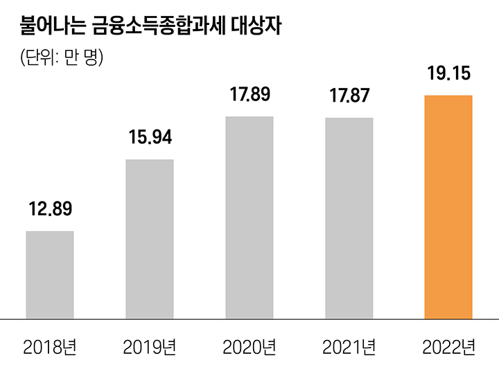 5월 종합소득세 신고기간이 도래하면서 금융소득 종합과세에 대한 관심이 높아지고 있다. 가파른 금 리 인상으로 고금리 예금가입자가 급증하여 작년 한 해 금융소득 2천만 원 초과자가 늘어나면서 금융소 득종합과세 및 건강보험료 폭탄에 대한 걱정이 날로 깊어지고 있다. 특히 소득이 없는 은퇴자나 고령자 에게는 치명적인 부담으로 다가올 수밖에 없다.