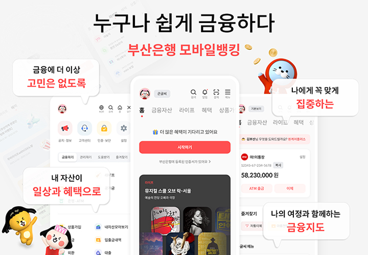 부산은행은 4월 26일 고객의 편의성과 접근성을 높이기 위해 모바일뱅킹 앱(App)을 새롭게 개편했다. 이번 개편으로 고객은 새로운 메인화면을 통해 자신의 대표 계좌 및 거래내역과 금융자산을 첫 화면에서 바로 확인 가능하며, 중요한 개인 금융일정과 고객 맞춤 상품 제안도 받을 수 있다. 전체 메뉴와 사용자 인터페이스도 사용자 중심으로 개선했으며, 고객이 자주 사용하는 메뉴를 즐겨찾기로 설정해 빠르게 접근할 수 있도록 했다. 이에 더해 마이페이지에서는 흩어져 있던 고객의 모든 금융 정보를 한눈에 확인하고 쉽게 관리 가능하게 변경했다.