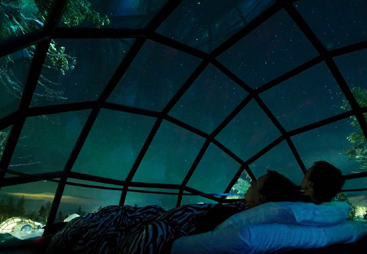 설령 경쟁률이 치열해 산타클로스를 위한 아르바이트를 못하게 되더라도 핀란드에는 꼭 한 번 가보고 싶은 곳이 있다. 바로 이 산타클로스마을에 자리한 산타스 이글루 아틱 서클(Santa’s Igloos Arctic Circle)이다. 이곳은 유리로 만들어진 이글루로, 겨울뿐 아니라 일 년 내내 이용할 수 있다. 창밖으로 설경이 펼쳐지는 이글루에서 오로라를 감상하며, 야외온천과 사우나를 즐기는 휴가야 말로 일생에서 한 번쯤은 해보고 싶은 환상적인 체험이 아닐까. 이글루 호텔 침대에 누워, 또는 창 바로 앞에 의자를 가져다 놓고 오색찬란 영롱한 빛을 뿜어내는 오로라를 보고 있노라면 너무 황홀해 현실이 아닌 꿈속에 있는 듯한 느낌이 들 것이다. 혹시 숙박하는 날에 오로라가 발생하지 않아도 서운해 할 필요는 없다. 맑은 밤하늘에서 금방 쏟아져 내릴 듯한 무수한 별들을 볼 수 있으니 말이다.