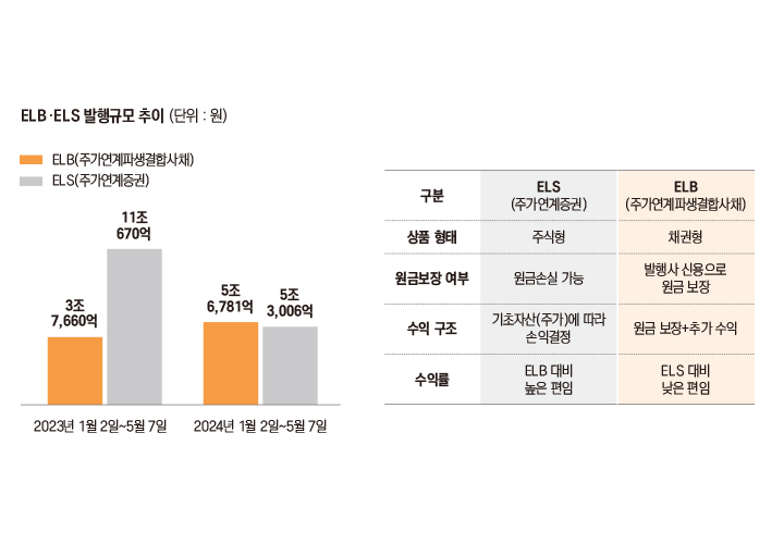 ELS(Equity Linked Securities, 주가연계증권)와 ELB(Equity Linked Bond, 주가연계파생결합사채)는 특정 주가지수나 개별종목 주가를 기초자산으로 정하고, 해당 기초자산이 정해진 조건을 충족할 때 정해진 금리를 주는 상품이란 점에서 같다. 하지만, ELS(주가연계증권)는 기초자산이 정해진 조건을 충족하지 못할 경우 원금 손실 가능성이 있지만, ELB(주가연계파생결합사채)는 발행하는 증권사가 원금 지급을 보장한다는 점에서 큰 차이가 있다.