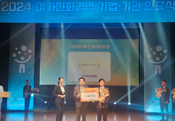 부산은행은 11월 6일 서울 남산국악당에서 열린 문화체육관광부가 주최하고 지역문화진흥원이 주관하는 ‘2024년 여가친화기업 인증식’에서 ‘지역문화진흥원 원장상’을 수상했다.