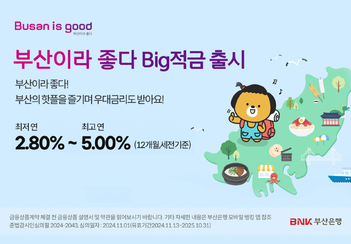 부산은행은 11월 13일 부산을 알리고 지역경제에 활력을 불어 넣기 위해 지역 핫플레이스 방문 인증 시 우대금리를 제공하는 ‘부산이라 좋다 Big적금’을 출시했다. 부산시 도시브랜드인 ‘Busan is good’의 첫 글자를 따서 만든 ‘부산이라 좋다 Big적금’은 기본금리 연 2.80%에 지역 핫플 방문 인증 우대금리 최대 2.00%p와 부산은행 동백전 사용실적 우대금리 0.20%p를 더해 최대 연 5.00% 금리를 제공한다.