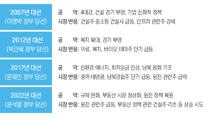 각 후보의 정책 방향에 따라 특정 산업이 민감하게 반응한다. 예를 들어 친환경 정책은 재생에너지, 전기차 관련주가 상승하고, 국방비 증대 정책안은 방산주의 상승을 부른다. 규제 강화가 예고되면 IT, 금융 등 일부 업종 약세를 보이며 감세 정책은 전반적인 주식시장 호재로 해석되기도 한다.