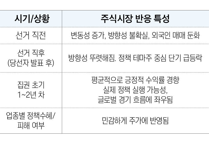 미국에서는 역사적으로 민주당 정부에서의 평균 주식 수익률이 공화당 정부보다 높았다는 통계가 있다. 이는 꼭 정책 차이 때문만은 아니다. 정부 출범 시 경제 상황, 글로벌 변수 등 복합적 영향 때문이다. 다른 나라에서도 비슷한 분석이 있으나, 반드시 “보수 vs 진보 = 악재 vs 호재” 구도로 단순화하기는 어렵다.