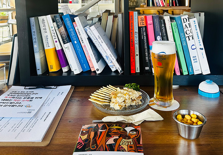 진주에 있는 라이비어리(Libeery)에 방문해 봅니다. 이곳은 책과 맥주가 어우러진 문화공간입니다. 일종의 사설 도서관처럼 꾸며진 공간에서 시원한 생맥주를 마시면서 책을 읽을 수 있습니다. 책꽂이가 있는 도서관 책상과 밖을 향해 있는 바 테이블, 곳곳에 흩어져 있는 책들과 은은한 조명 장치들 그리고 잔잔히 흐르는 재즈. 이러한 분위기에서 책을 읽고 있으니, 마치 일본 작가 무라카미 하루키가 된 듯한 기분입니다. 하루키는 일본의 유명 소설가이면서 맥주를 유독 사랑하는 작가입니다. 그의 데뷔작 <바람의 노래를 들어라>를 보면, 주인공이 제이스바에서 레코드를 듣거나 책을 읽으면서 맥주를 마시는데, 이렇게 한낮에 맥주를 마시면서 책을 읽으니 소설 속의 한 장면처럼 느껴졌습니다.